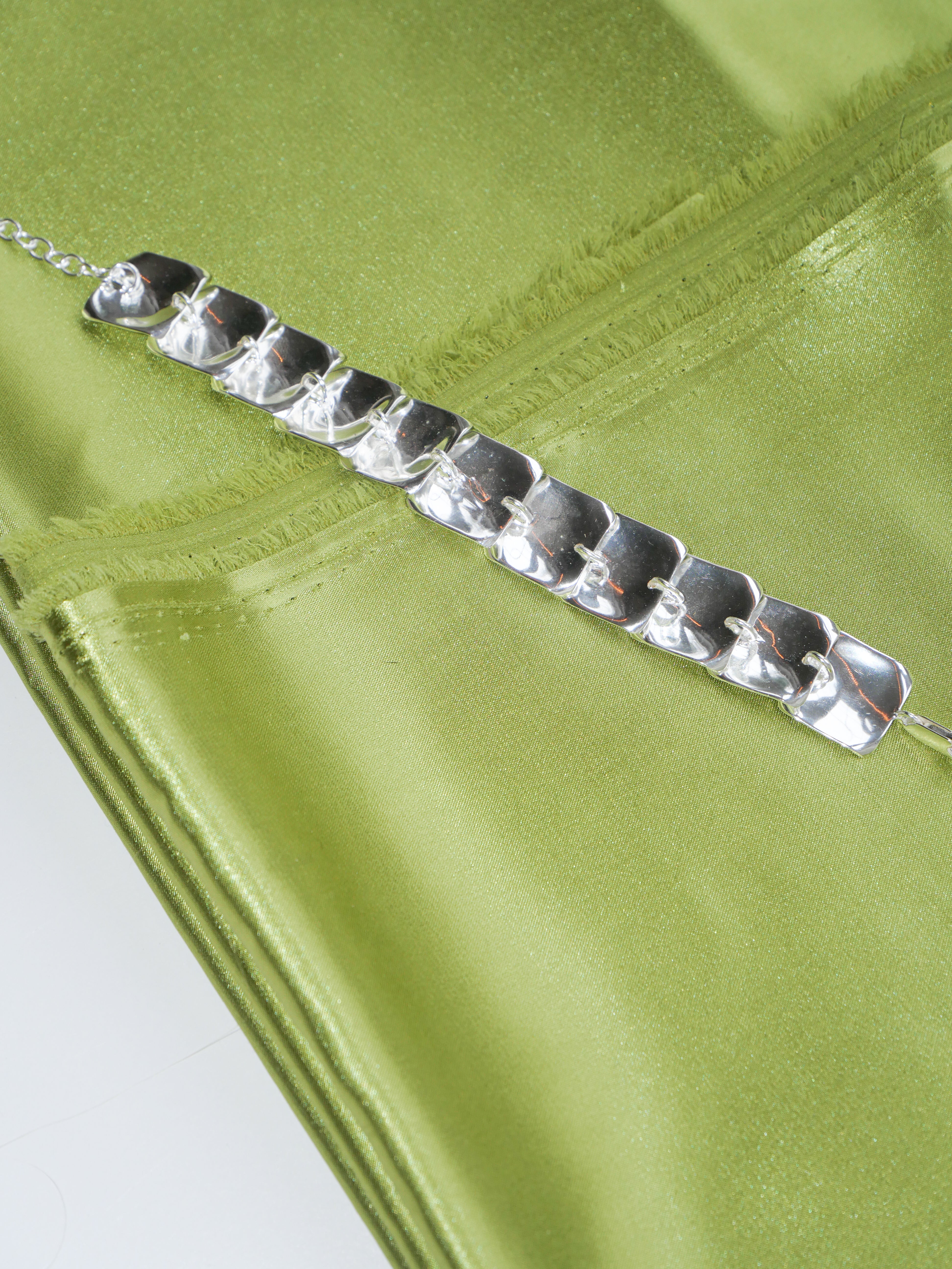 The Aura Bracelet translates the signature design of the Aura collection into a refined wrist piece. Crafted with the same mirrored, sculptural elements, it moves fluidly with the body while maintaining a strong visual presence.