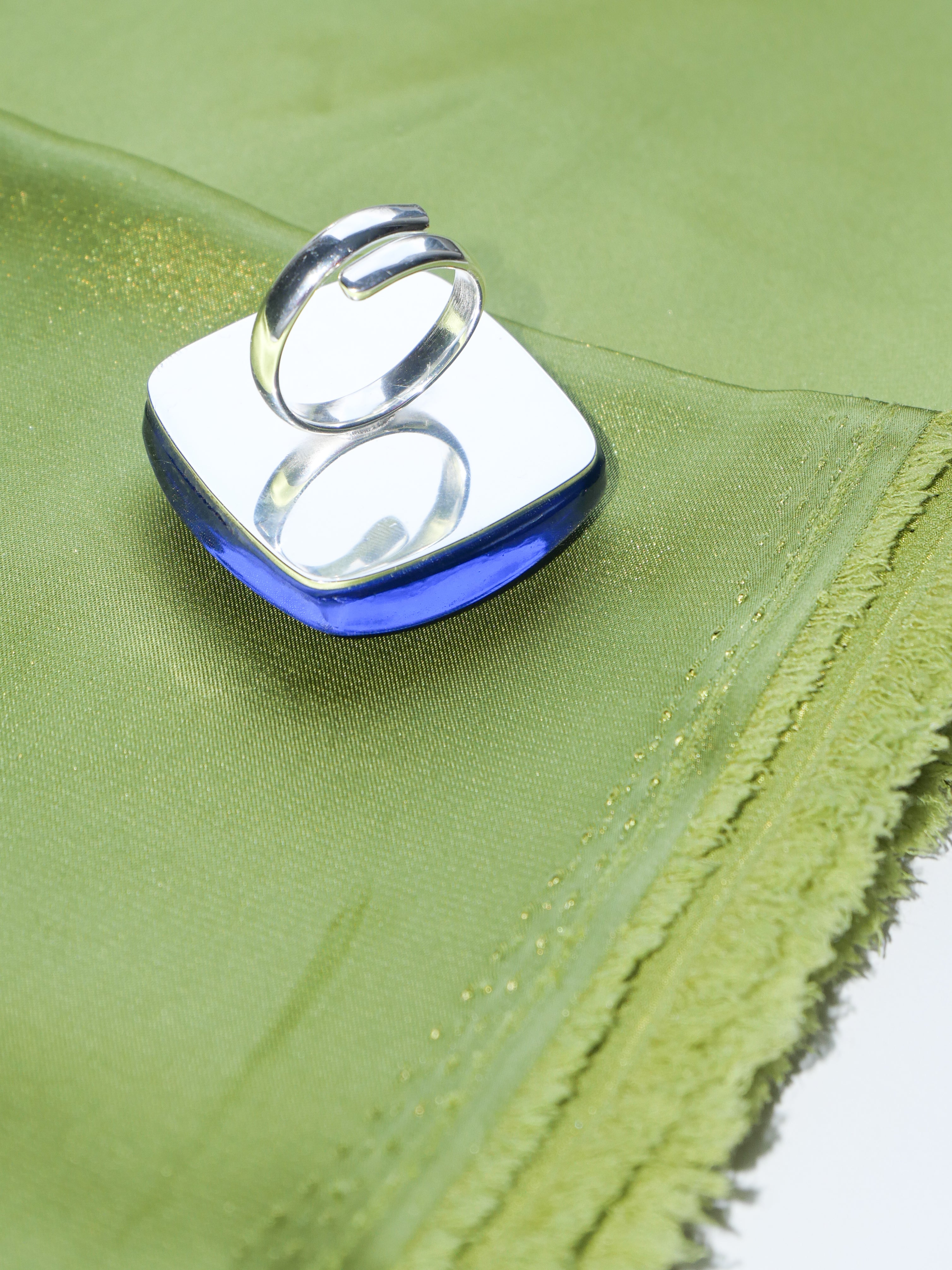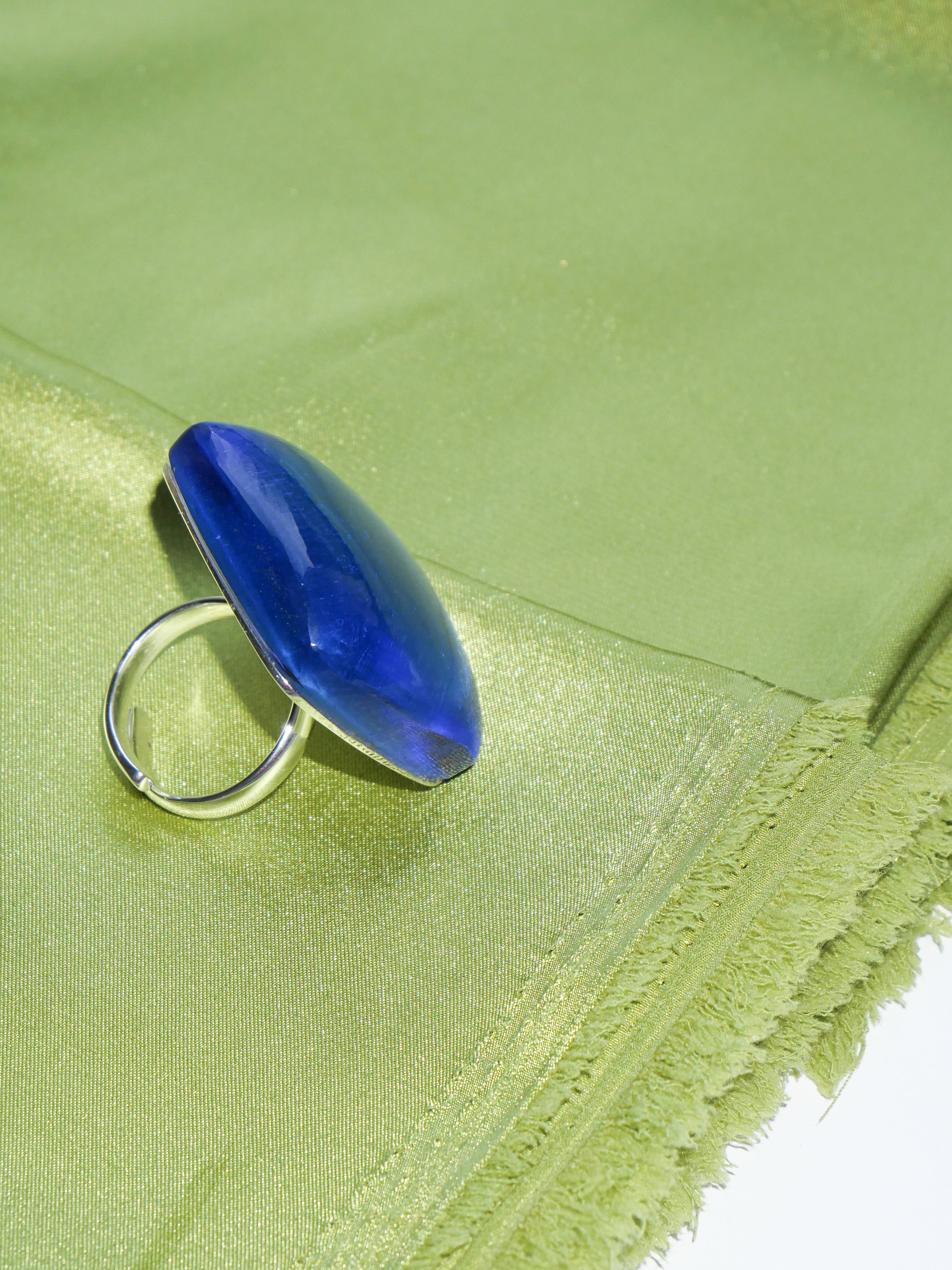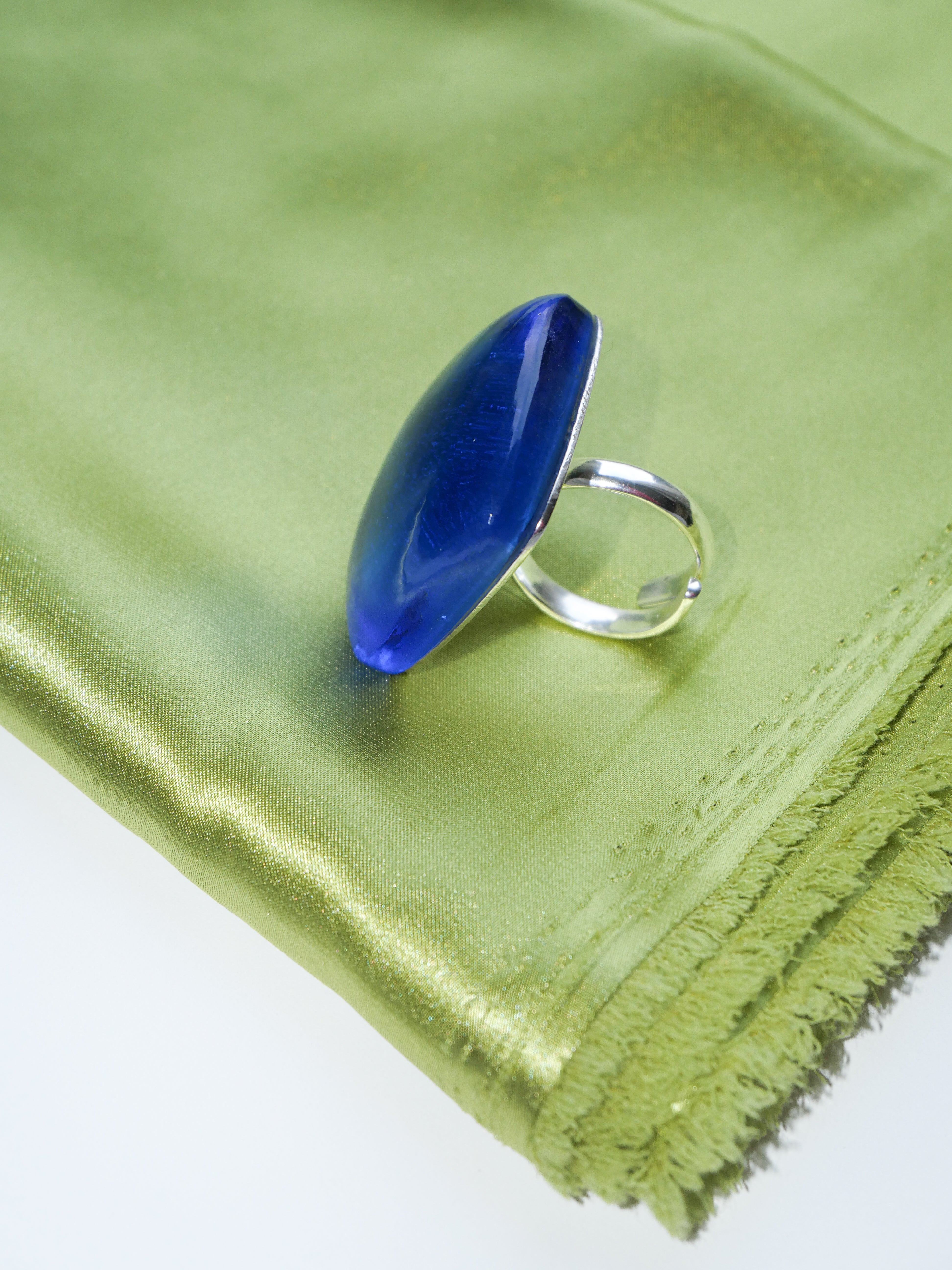 The Bleu Ray Ring is a compact yet powerful statement piece. Its sculptural shape and deep blue accent create a sense of focus and clarity, drawing the eye without overpowering the hand.