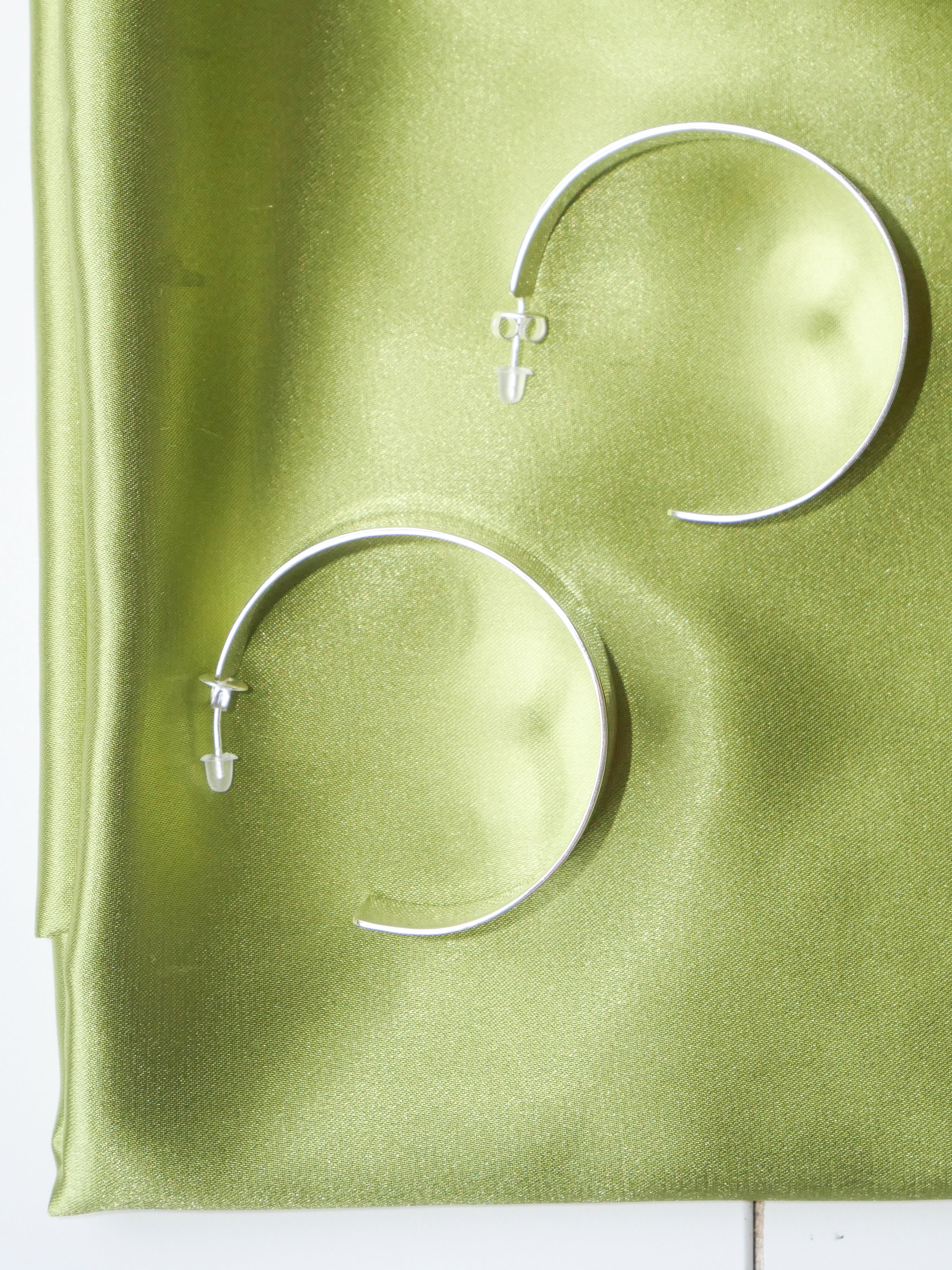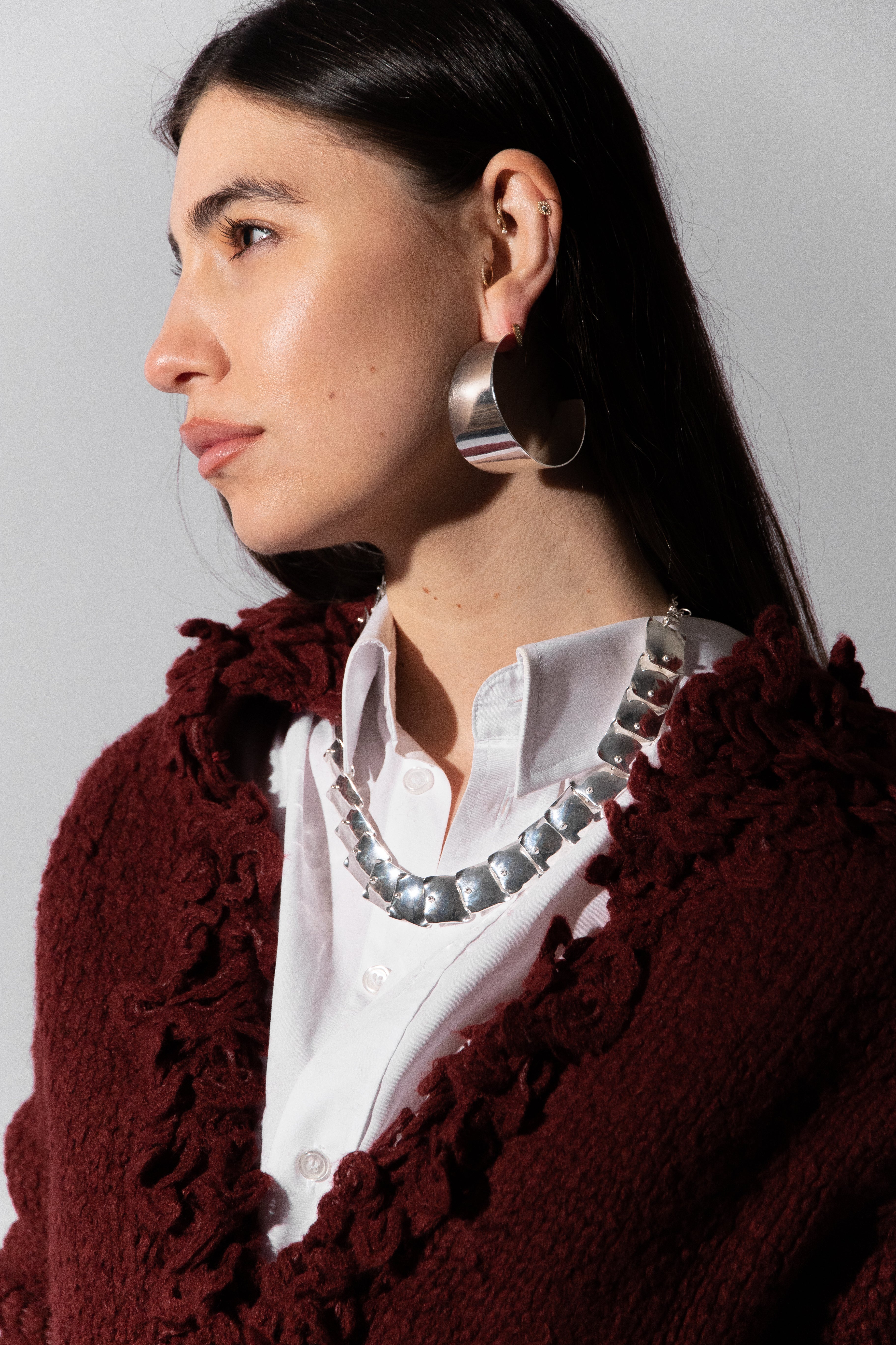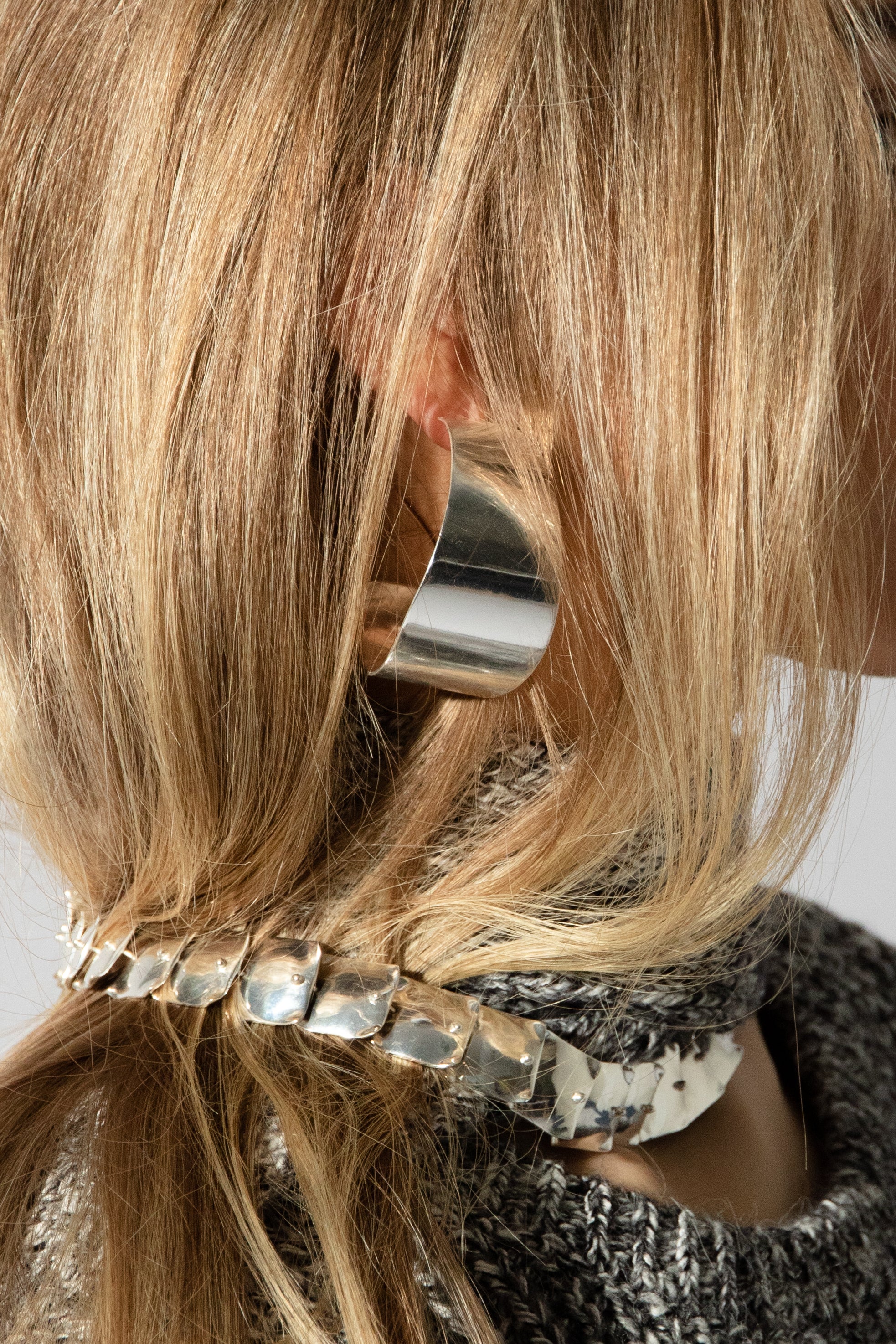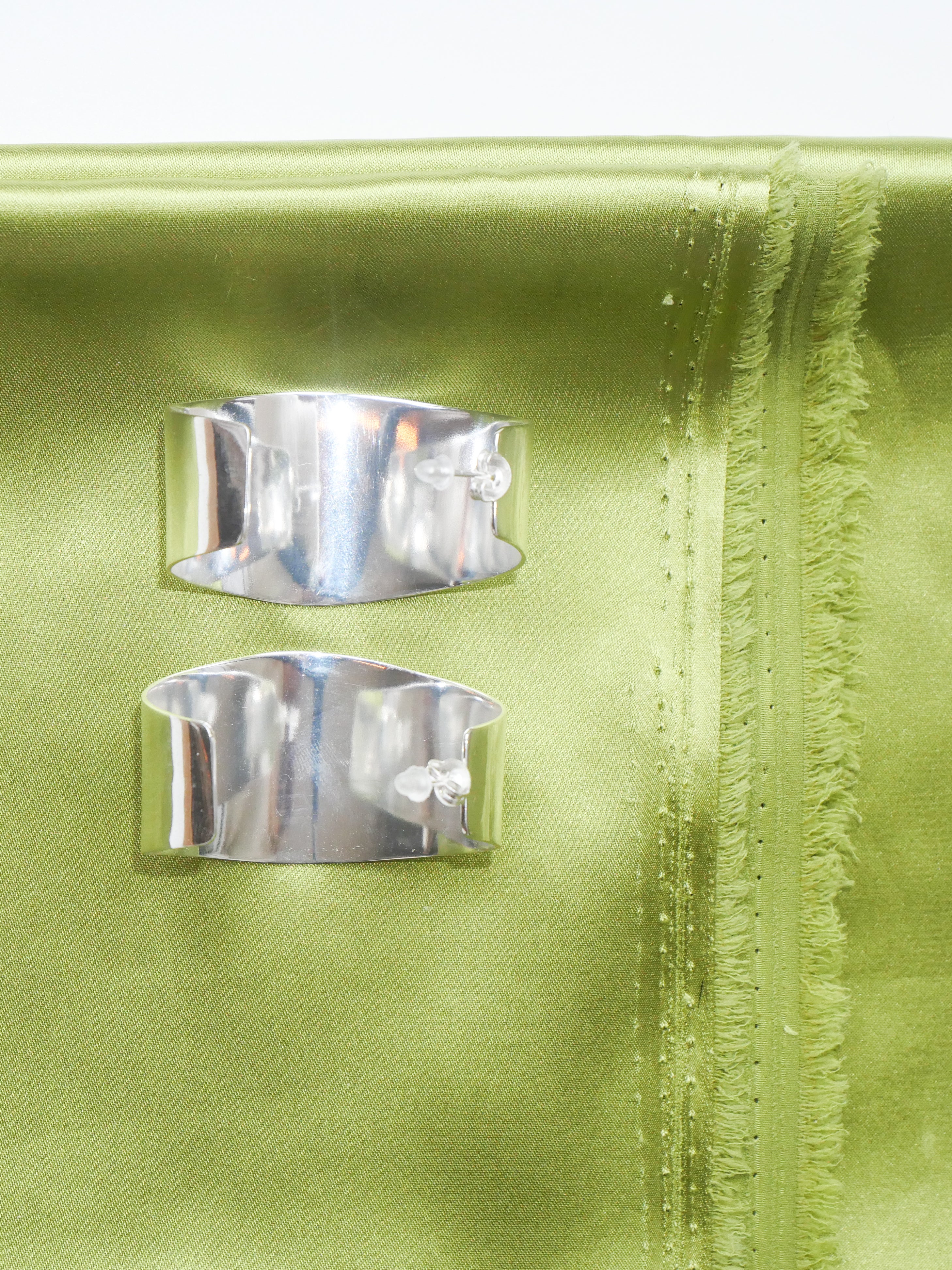 The Lunar Hoop Earrings are defined by their strong, curved silhouette and polished, light-reflecting surface. Inspired by the shape and presence of the moon, these hoops balance bold volume with a clean, modern form.