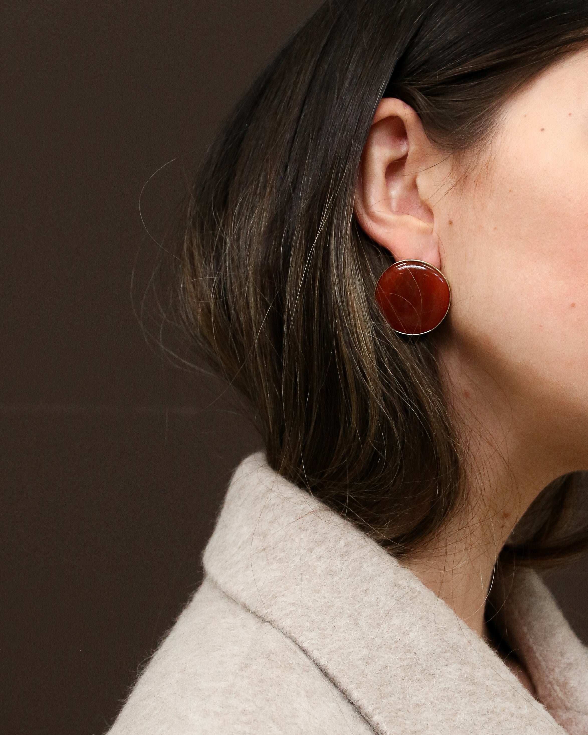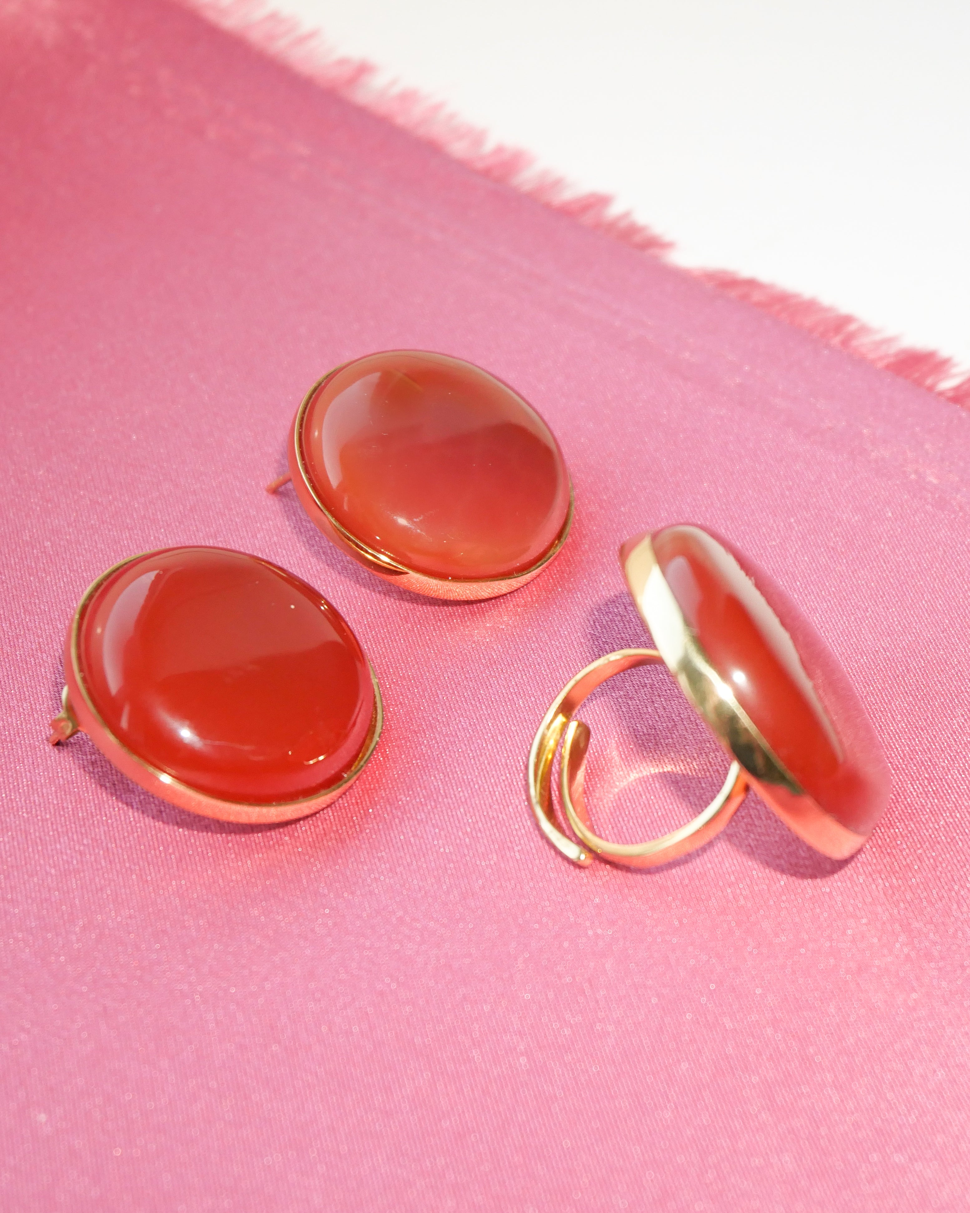 The Red Onyx Set includes a stunning combination of the Red Onyx Ring and matching stud earrings, both featuring bold round red onyx stones framed in sleek brass. The rich red and gold hues create a chic, timeless look that’s perfect for any occasion, from casual moments to evening glam. Onyx is known for its grounding and protective energy, adding deeper meaning to this elegant duo.