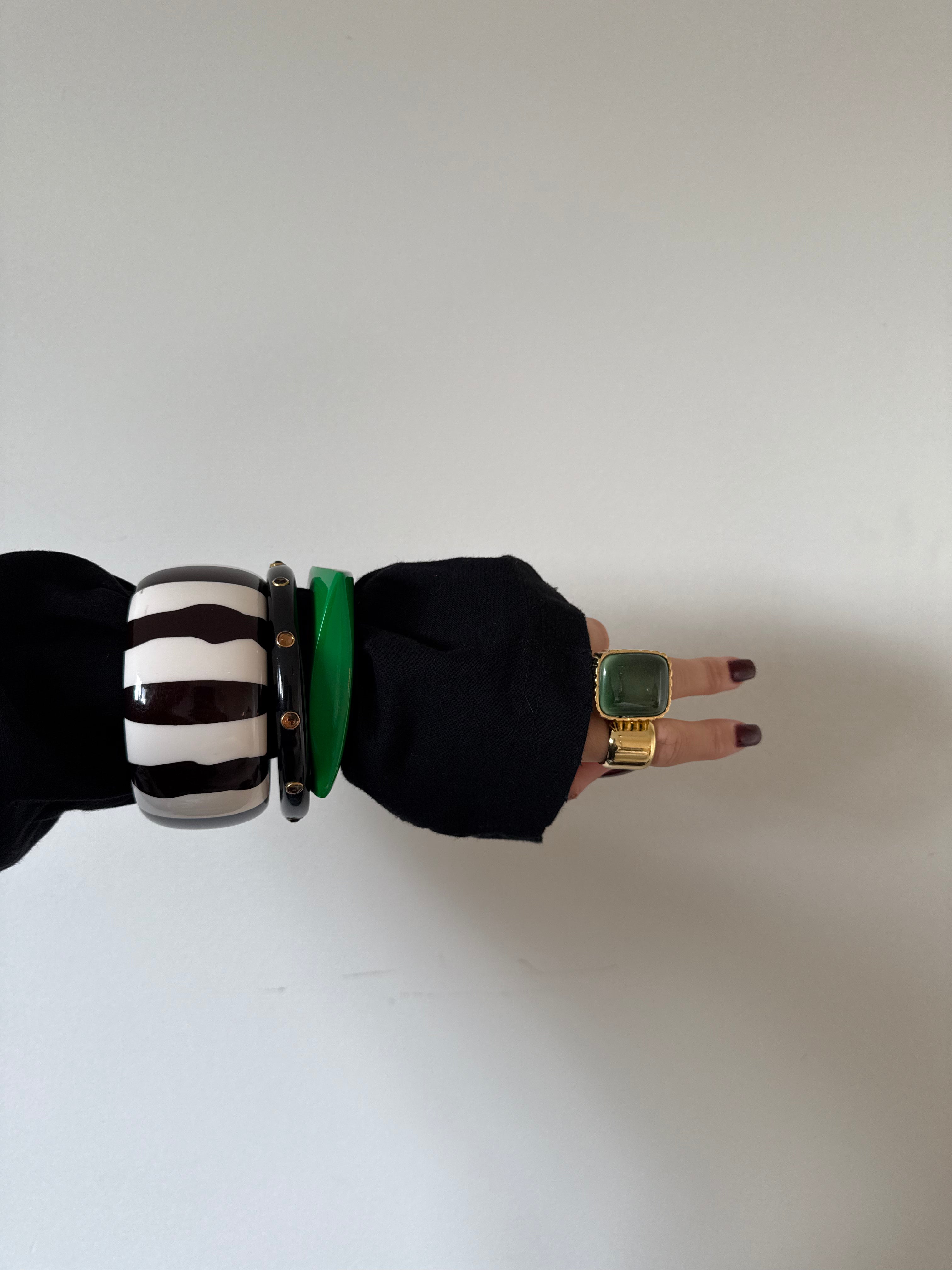 Command attention with The Zebra Print Bangle, an extra-thick resin design in bold black and white. Its graphic pattern and chunky silhouette create instant impact. Wear it alone or combine it with The Gemstone Bangles and The Colored Bangles for a dynamic, eye-catching stack.